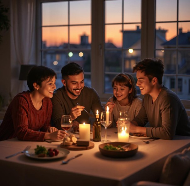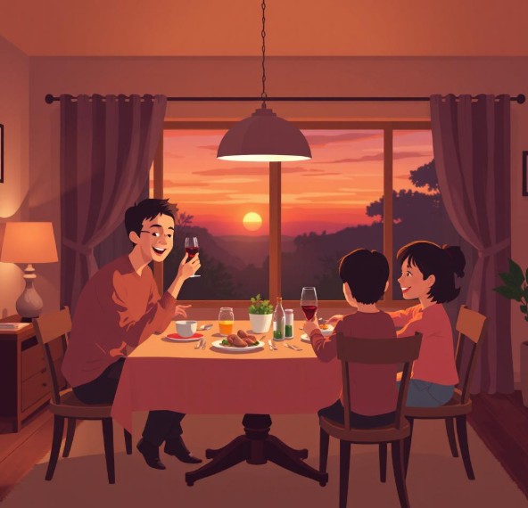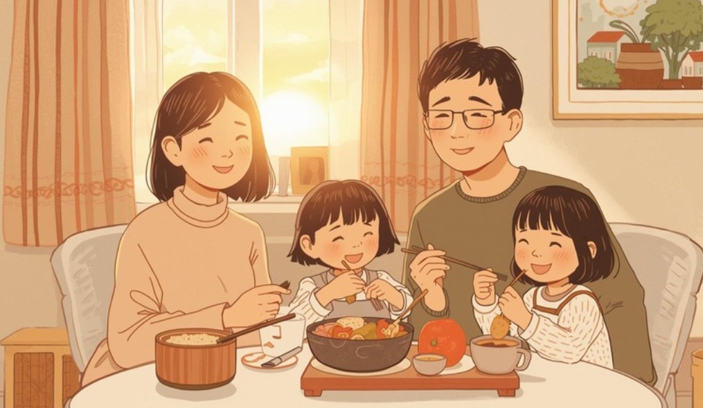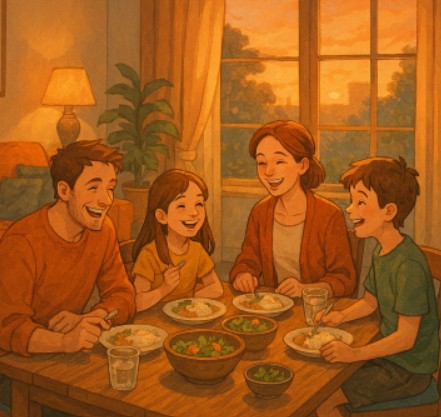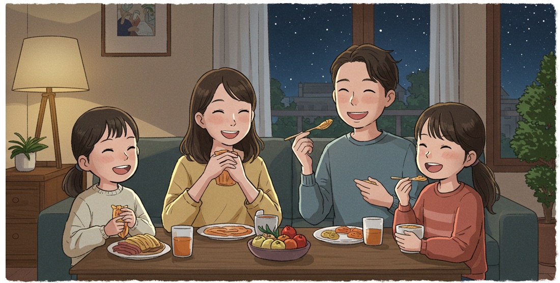 • プロンプト(日本語):「夕暮れのリビングで家族4人が笑顔で食事をしている、温かい雰囲気のイラスト」