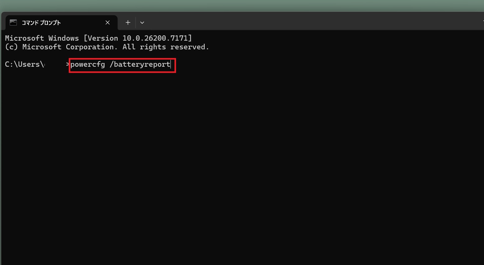 [コマンド プロンプト]画面の最後点滅しているところに[powercfg /batteryreport]と入力します。それからEnterキーを押下!