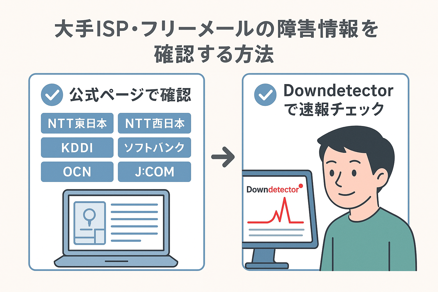 そこで「自分のパソコンやスマホの故障なのか」「サービス側の障害なのか」をすぐに確認できる方法を知っておくと安心です。この記事では、大手ISP(インターネットプロバイダ)やフリーメールサービスの障害情報を確認する方法をまとめました。