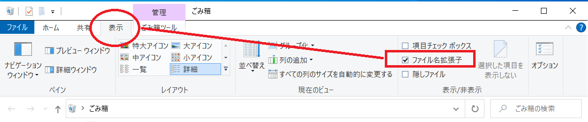 そして上図のように「ファイル名拡張子」にチェックが入っているか確認します。