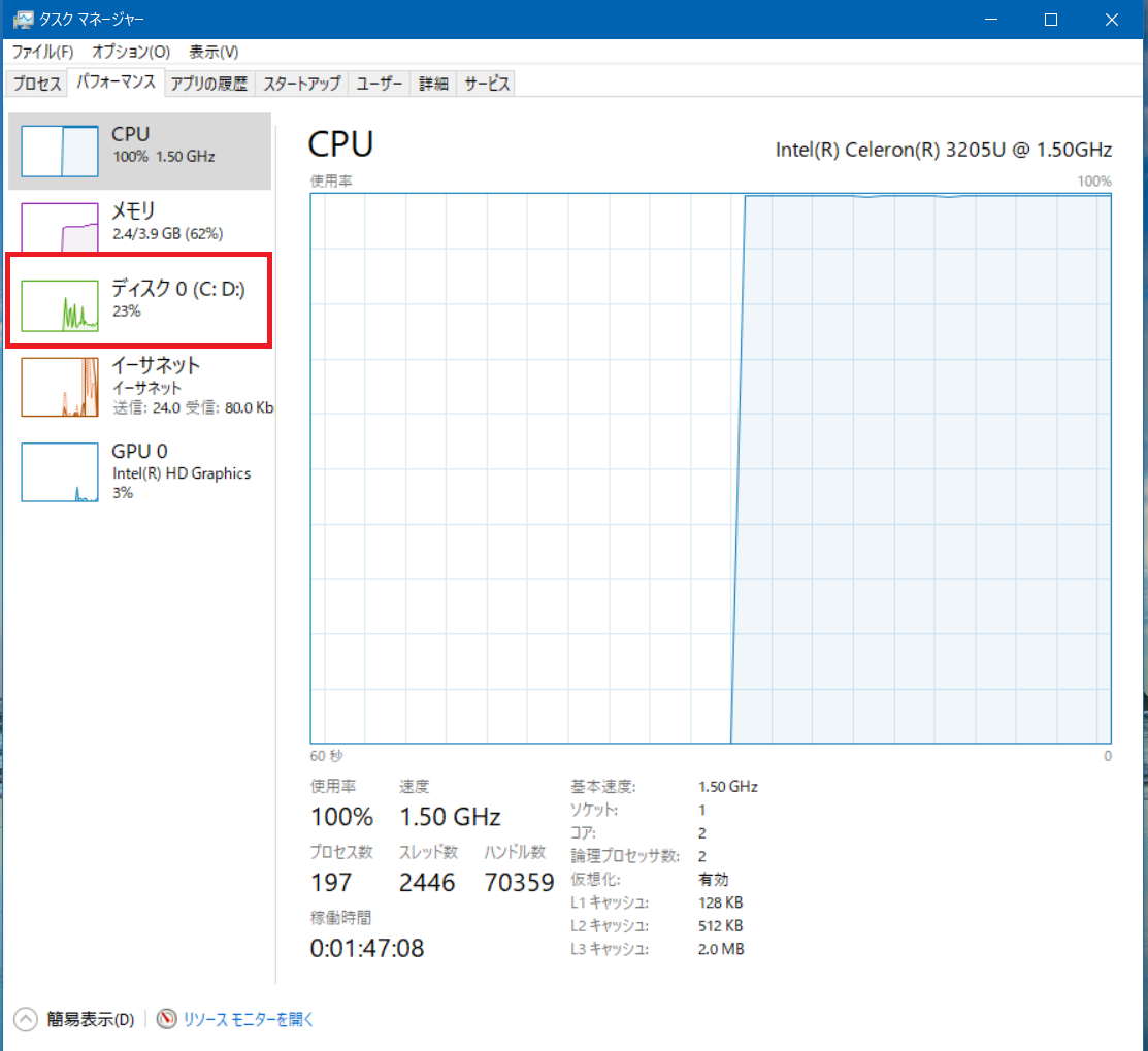 SSD換装成功!やっぱりSSD!!(ディスク100%)