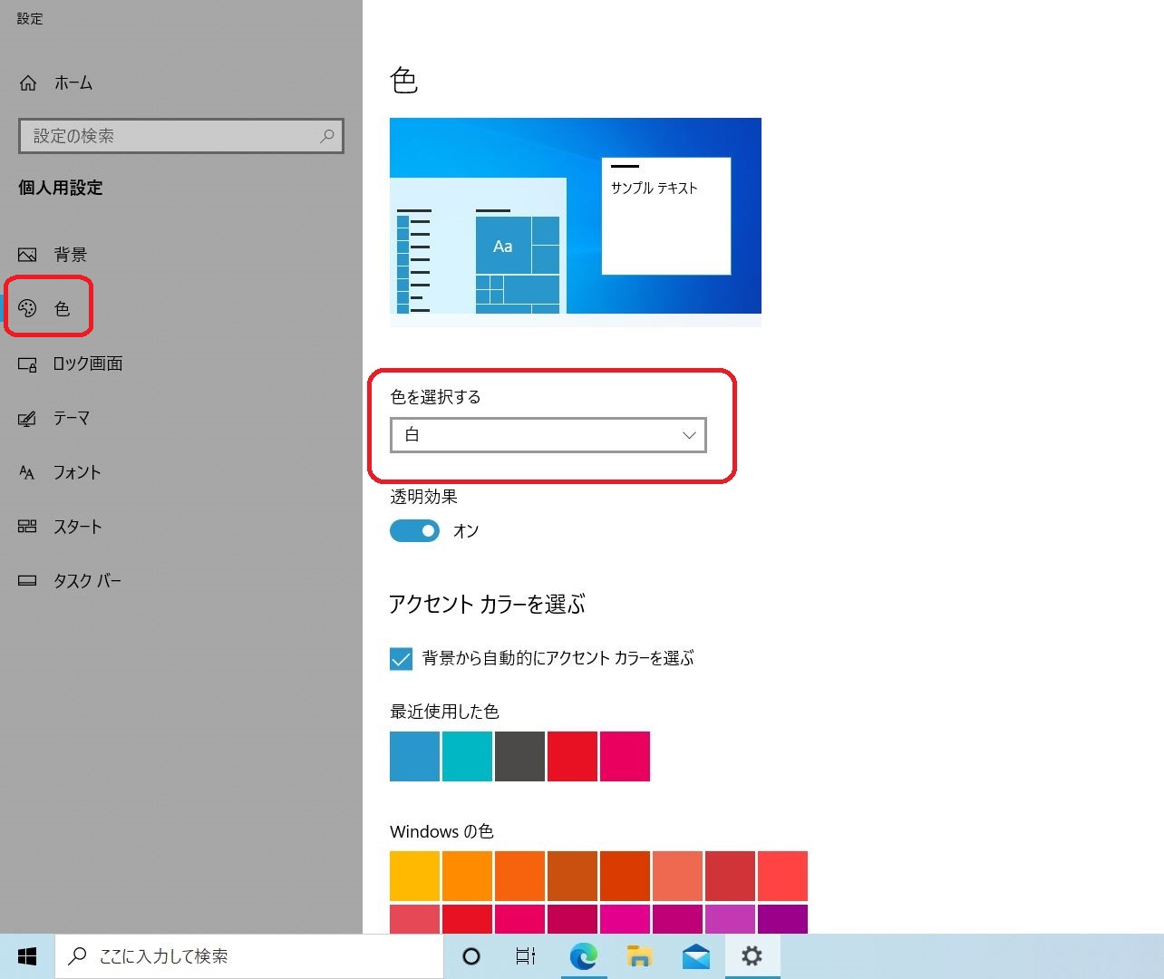 2.表示された画面の左の項目の[色]を選択します。[色を選択する]が恐らく[白]になっていますのでここをクリック