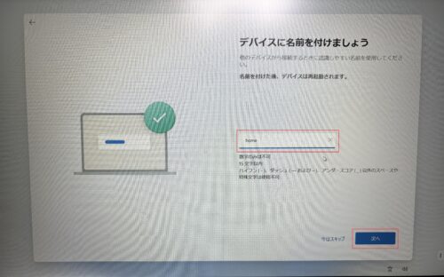 - 「今はスキップ」もありますが、複数PCを使う場合に識別しやすくなるので設定推奨。この画面ではhomeと入力しています。